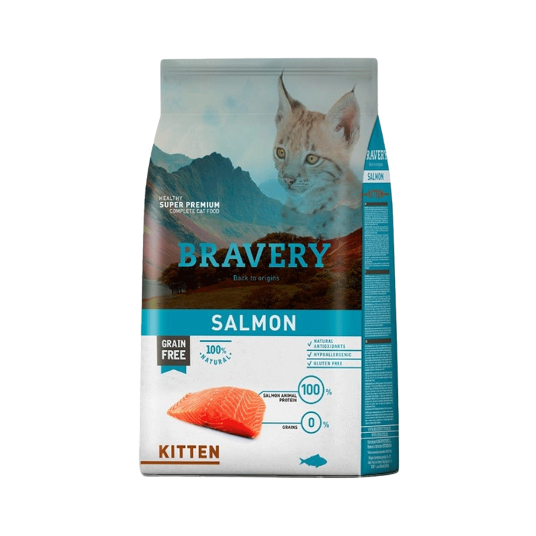 El alimento Bravery Salmón Kitten está elaborado con 100% salmón deshidratado, una fuente de proteína de alta calidad que favorece el desarrollo muscular y una digestión saludable. Su fórmula hipoalergénica y monoproteica, libre de granos y gluten, está especialmente diseñada para gatitos desde el destete hasta los 12 meses, incluyendo aquellos con alergias, intolerancias o sensibilidades alimentarias.