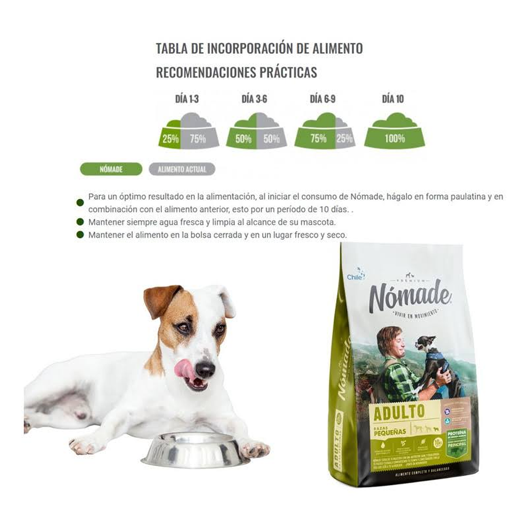 Con una fórmula libre de colorantes artificiales y elaborada con ingredientes naturales, Nómade es la elección perfecta para dueños que buscan un alimento balanceado, saludable y de alta calidad para perros adultos de razas pequeñas.